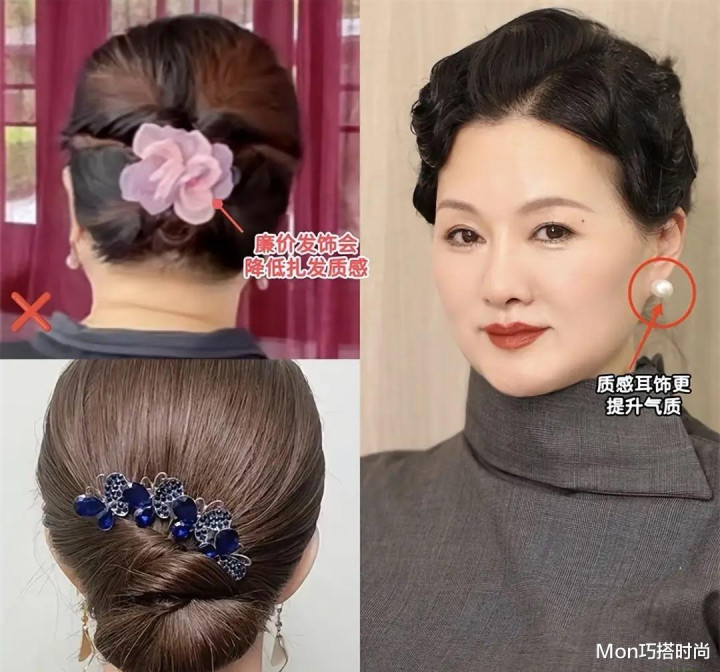 盘发肯定是离不开发饰的,但发饰的选择很讲究,身边好多大妈随便选一款廉价的塑料发饰戴在头上就出门,自以为很时髦,背后一看特别的拉垮,穿得再高级也会变得廉价感十足。