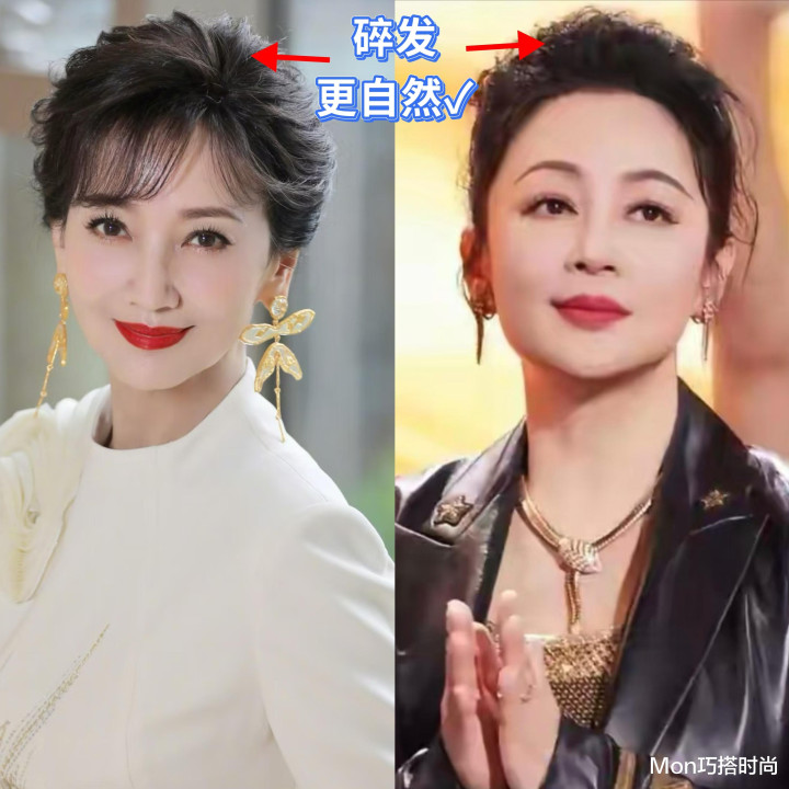 上年纪的女人,发际线多多少少都会后移,要是额头不好看不饱满,颧骨突出,那在盘发的时候可以试试剪个刘海,能把面部不流畅的问题掩盖一下,顺带着还可以起到显脸小的效果哦。但刘海不能太厚,空气刘海、三七分斜刘海都不错~